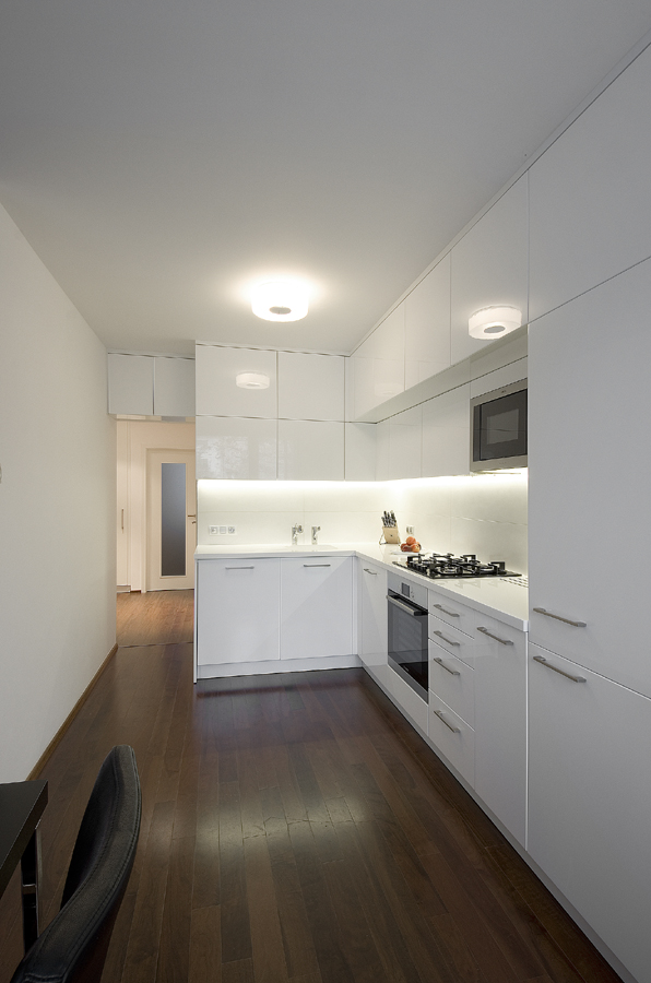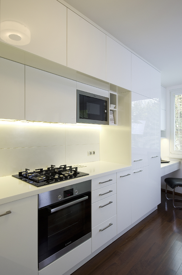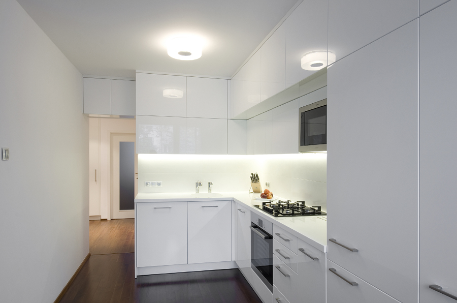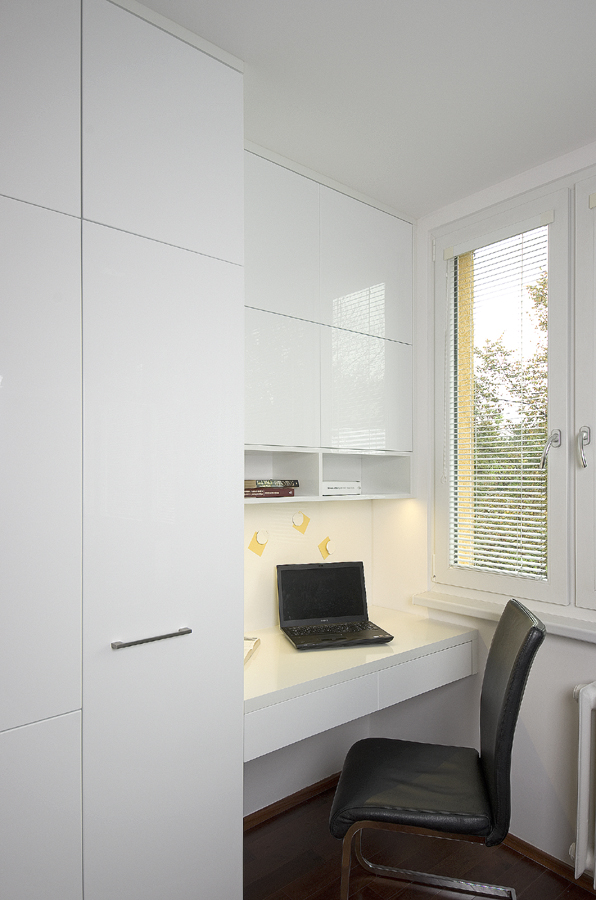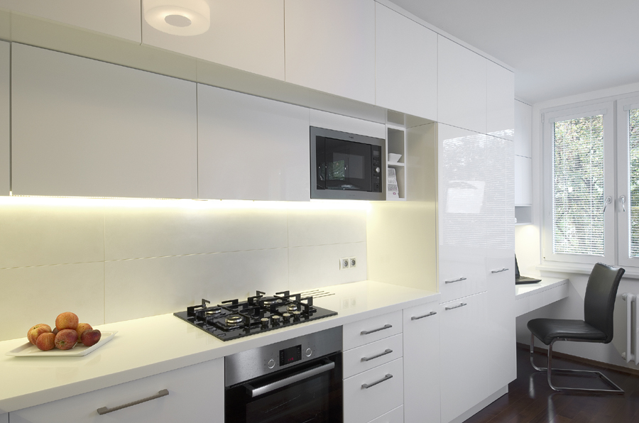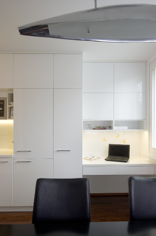 Starou kuchyň nahradila nová v bílém lesku. Pro vnitřní vybavení skříněk se použily chytré úložné systémy. Na kuchyň navazuje pracovní kout s magnetickou deskou a skříňkami na dokumenty.