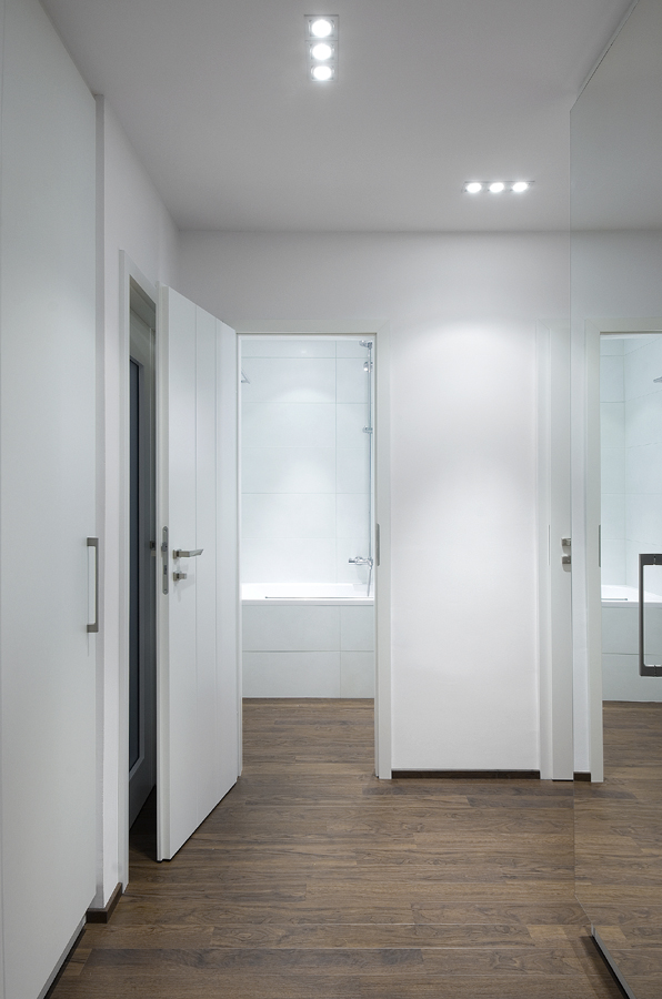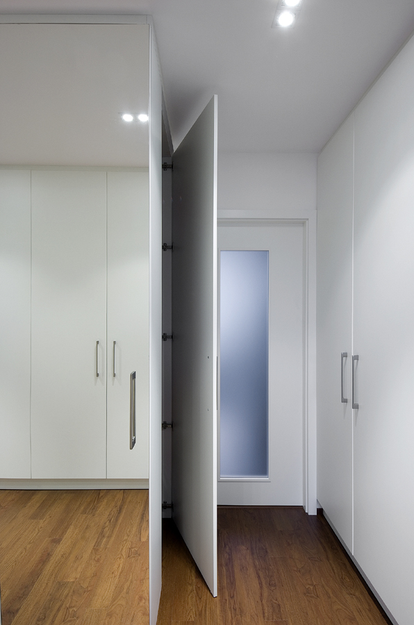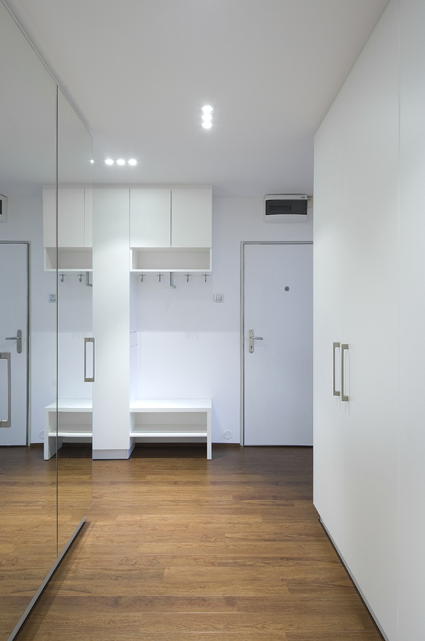 Dalším úkolem bylo maximalizovat úložné prostory. V takto malém bytě bylo nutné využít každý kout. Důležité bylo vyvarovat se stísněnosti a zachovat pocit prostoru. Tomu pomáhá vestavěný nábytek v bílém lesku, který dobře kontrastuje s tmavší podlahou.