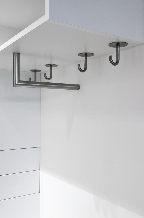 Hned vedle vstupních dveří jsou háčky pro bundy, kabáty a šuplíky na klíče a jiné drobnosti