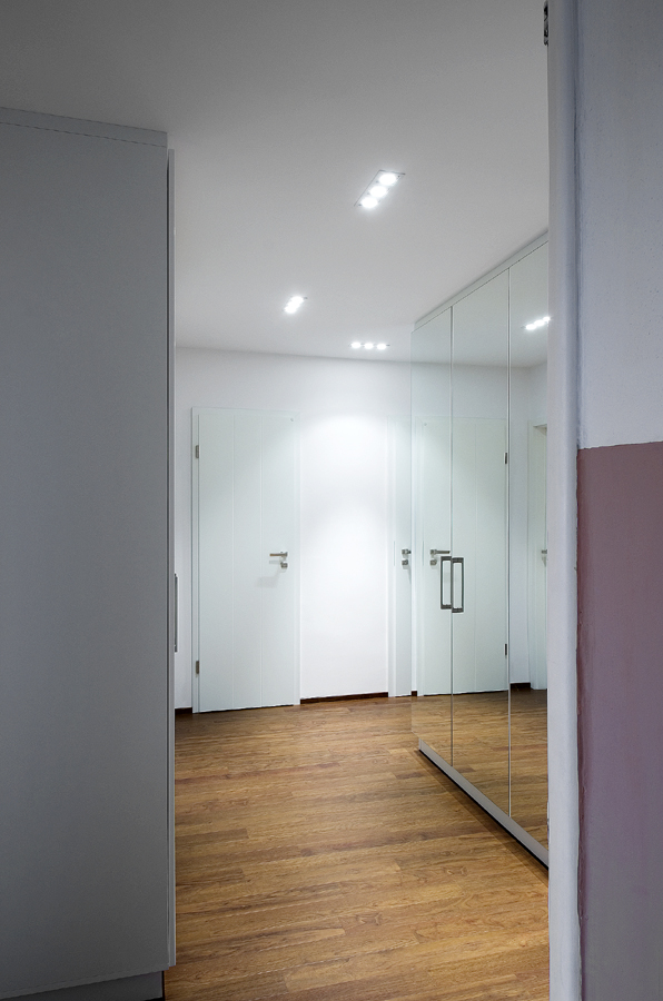 Na začátku spolupráce se prověřovaly možnosti celkové změny dispozice bytu včetně posunů nenosných příček. Majitelé bytu se nakonec se členění bytu zachovat a rekonstrukce znamenala hlavně změnu materiálů, dveří, rozvržení a funkčnost nábytku a vybavení bytu.