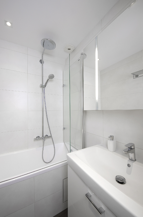 Koupelna a toaleta jsou odděleny a pro oba prostory byly použity stejné materiály. Na stěnách je bílý, velkoformátový obklad. I sanita je v klasické bílé. Vana je doplněna sprchovým sloupem s velkou sprchovou hlavicí a sklopnou sprchovou zástěnou. Na toaletě se nachází pračka a nad ní praktická vestavěná skříňka.