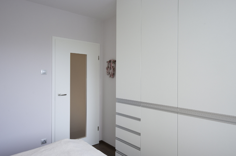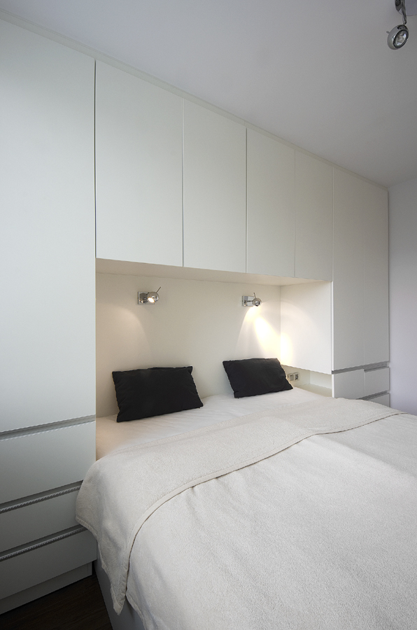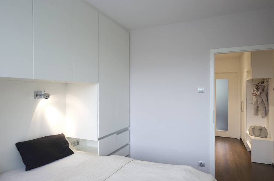 Ložnice je velmi malá a při navrhování nábytku bylo nutné hlídat každý centimetr. I proto najdeme úložné prostory kolem postele, naproti i pod postelí. Nábytkové úchytky jsou zapuštěné do hrany a nevystupují do prostoru. Vedle postele jsou po obou stranách úložné niky, které slouží jako noční stolky. Nábytek na míru je promyšlen do posledního detailu, aby se našlo místo pro všechny potřebné věci.